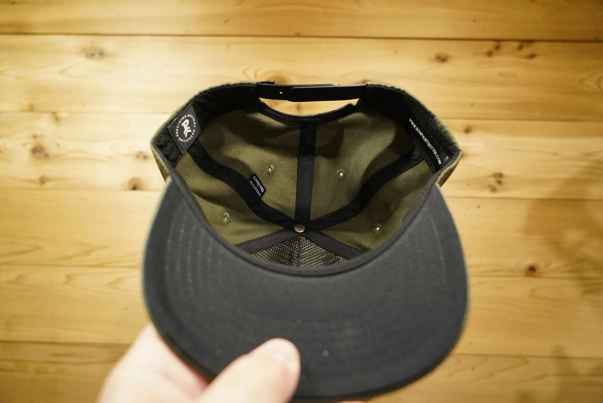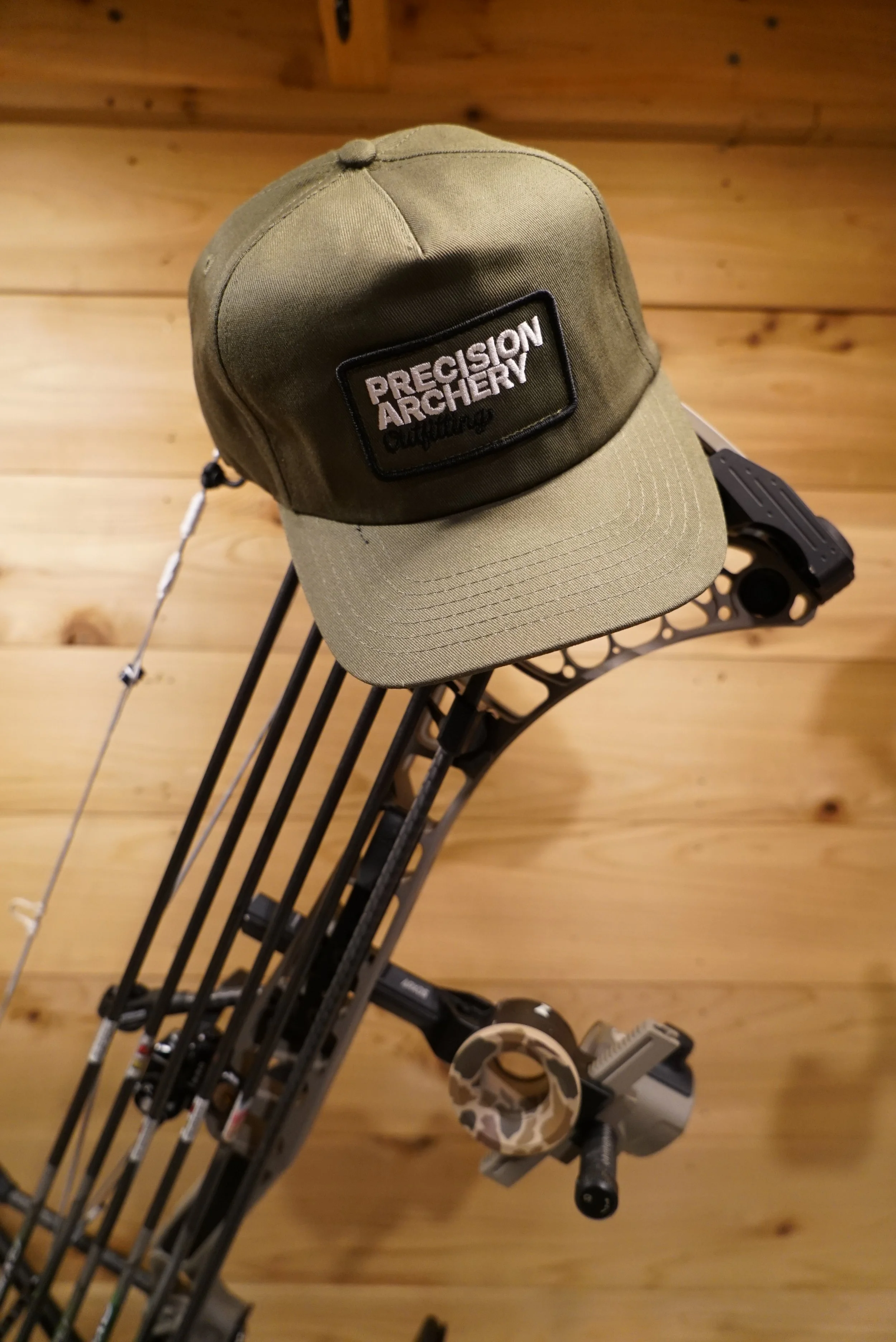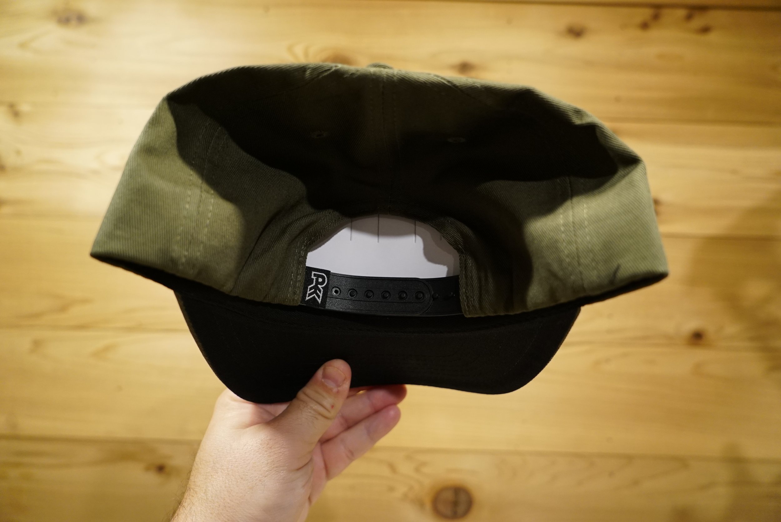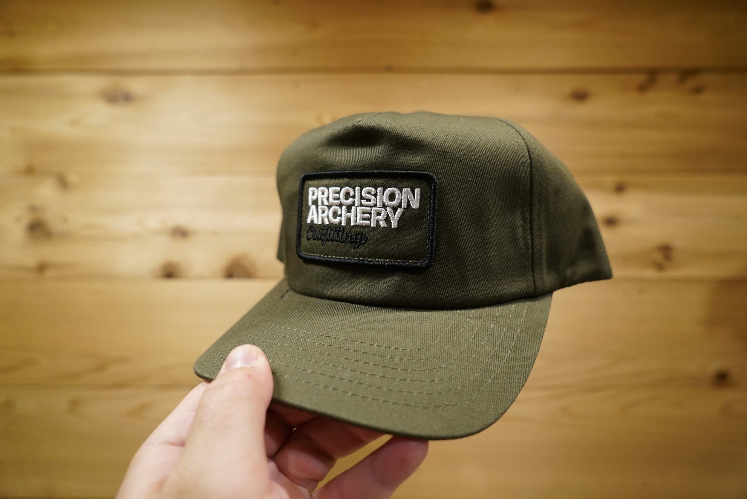 A CLASSIC 5 PANEL CAP WITH OD GREEN FABRIC AND EMBROIDERED PATCH. STRUCTURED WITH INTERIOR MESH ON FRONT PANELS.