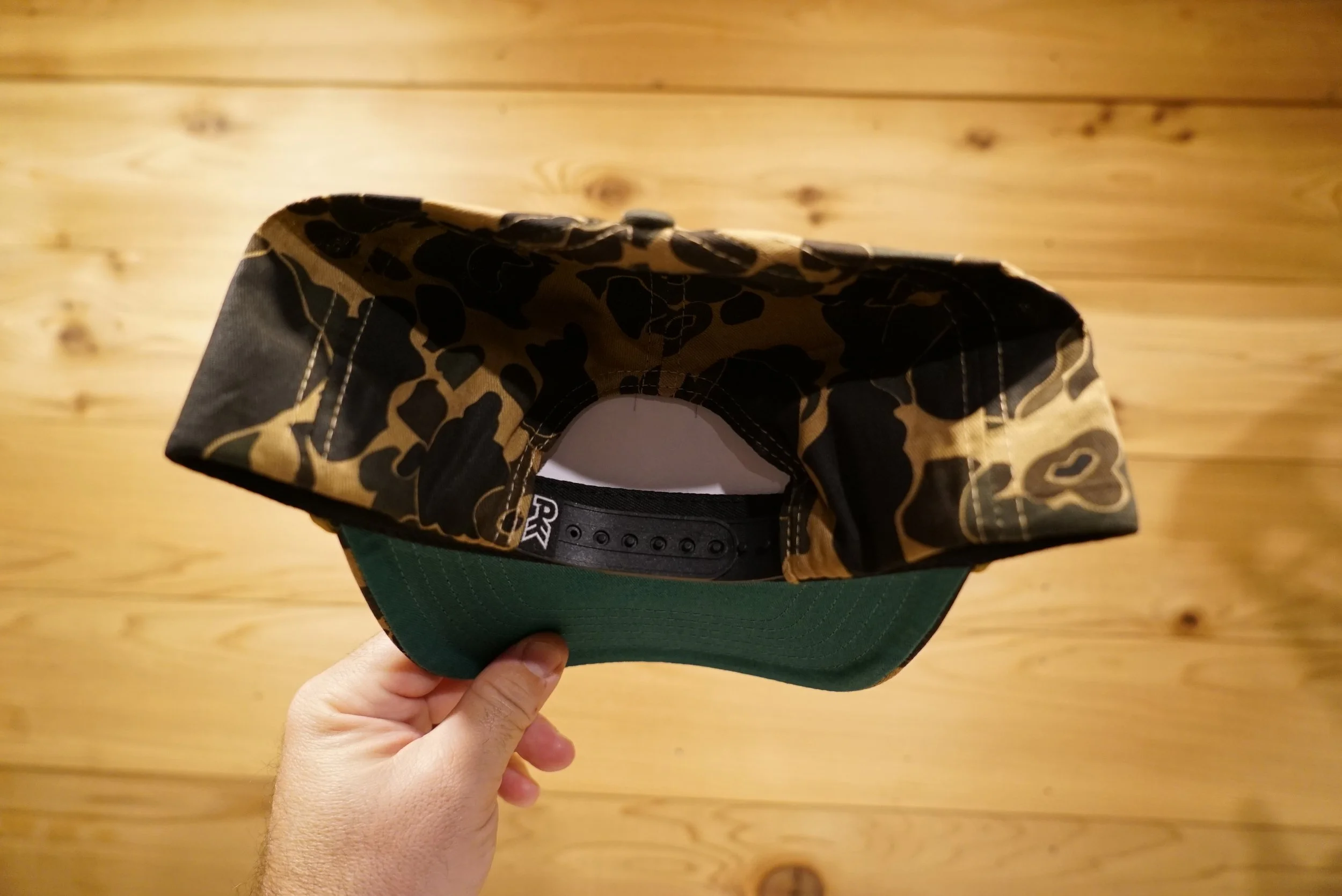 A 5 PANEL ROPE HAT IN OLD SCHOOL DUCK CAMO TO WITHSTAND THE TEST OF TIME WITH STYLE. MESH INTERIOR FRONT PANEL FOR STRUCTURE. GREEN UNDER BILL FOR A CLASSIC TOUCH.